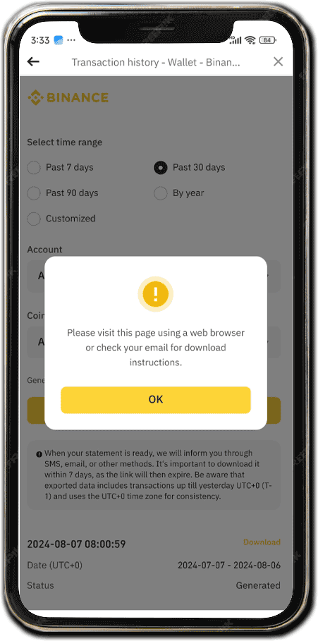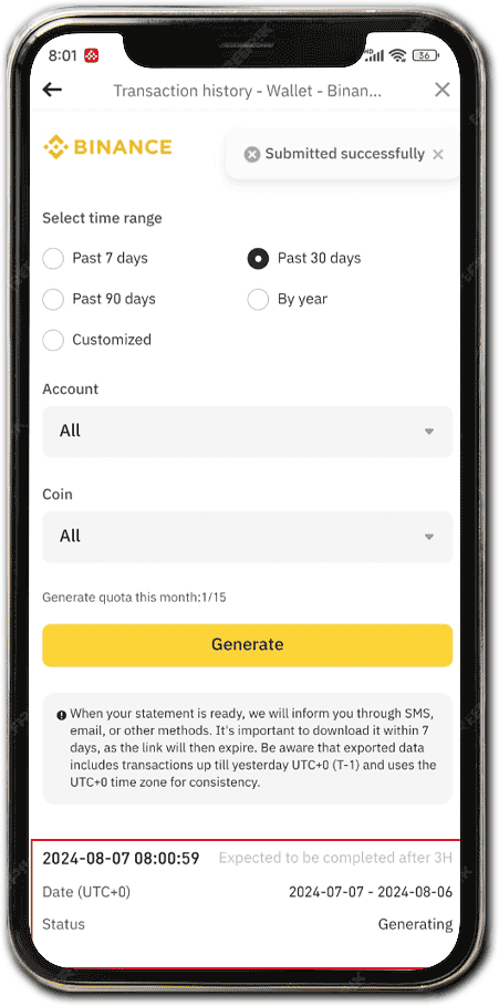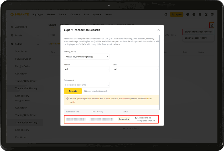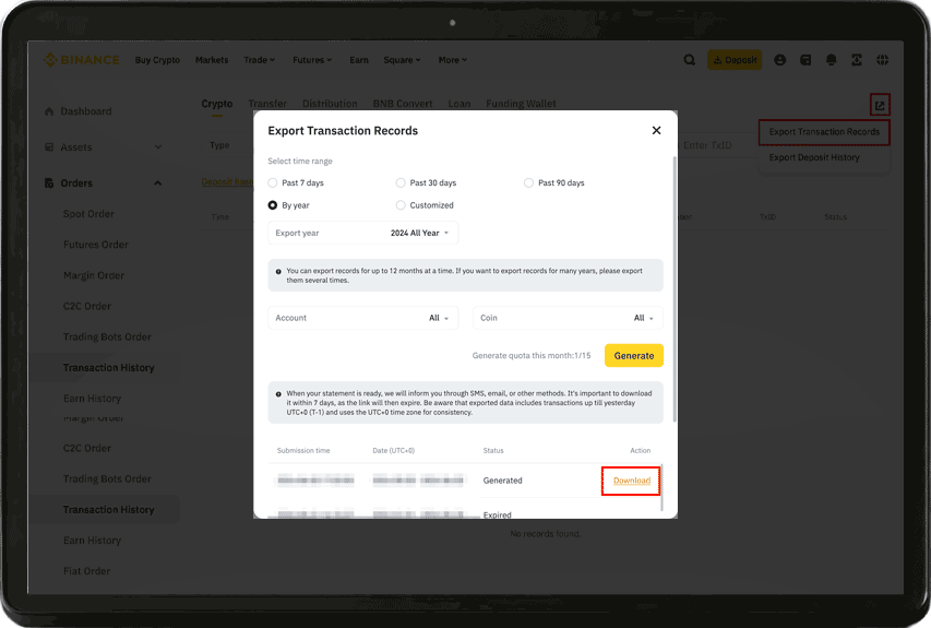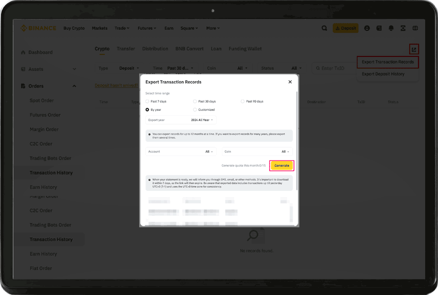 A questo punto ti si aprirà una finestra, all’interno della quale dovrai indicare l’intervallo di tempo, l’account e la criptovaluta utilizzata per i pagamenti. Per essere certo di non perderti nessuna transazione puoi lasciare selezionate tutte le criptovalute, tutti gli account e impostare l’intervallo temporale a 90 giorni o più. Per avanzare la richiesta dovrai premere sul tasto Genera, come nell’immagine qui in basso
