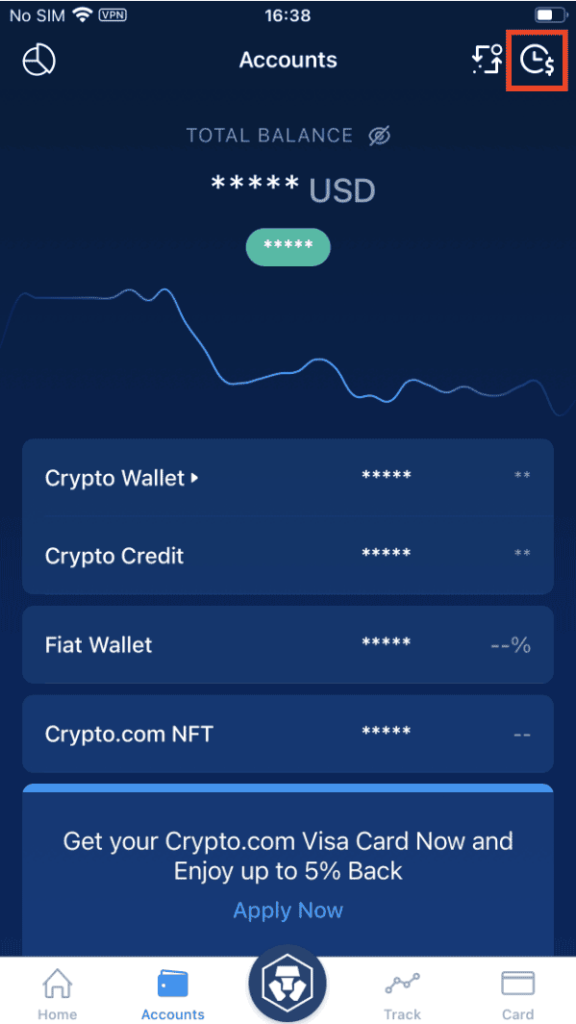 Per poter ottenere lo storico dei pagamenti in criptovalute con cripto.com devi necessariamente utilizzare l’app e, prima di tutto accedere al tuo account, com mail e password. Successivamente, per visualizzare lo storico, dovrai cliccare sull’icona in alto a destra, con l’orologio, che evidenziamo in rosso nell’immagine seguente