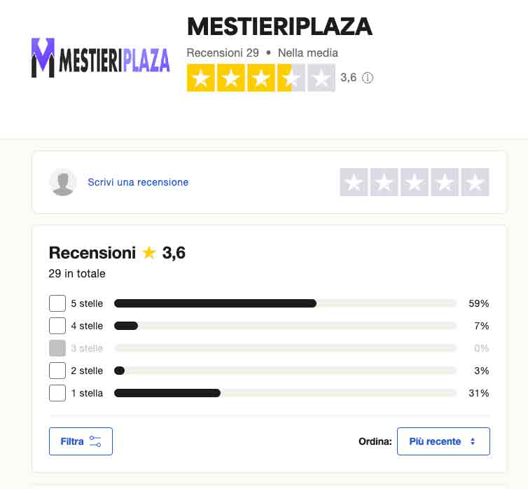 Sorprende, infatti, scoprire che mestieriplaza.com abbia un suo profilo Trustpilot e che su di esso non si concentrino esclusivamente le numerose recensioni negative dei tanti che sono stati già truffati. Le recensioni negative si accompagnano, infatti, a tante altre assolutamente positive. Basti pensare che, nel momento in cui scriviamo quest’articolo, ben il 59% delle recensioni sono a 5 stelle e solo il 31% sono a 1 una stella.